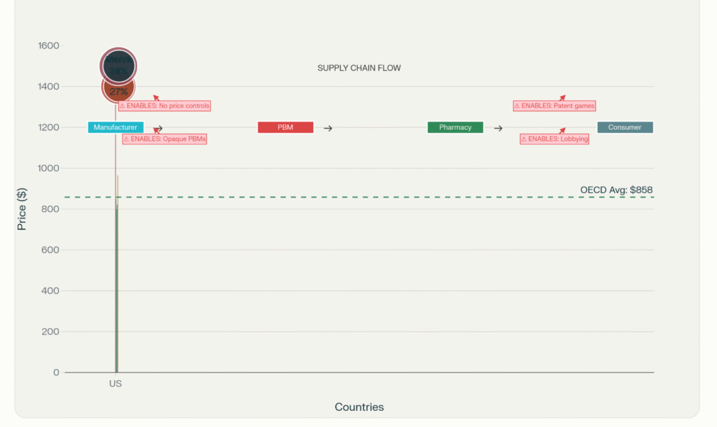 America’s drug pricing regime lacks the checks found in other countries. Unlike virtually every other wealthy nation, the U.S. permits manufacturers to set high list prices and imposes no government negotiation for Medicare Part D or outpatients. Middlemen like pharmacy benefit managers (PBMs) and insurers then haggle for rebates behind closed doors, often rewarding higher list prices with bigger kickbacks.